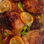 5. Bake for 35-40 minutes until chicken is cooked through completely (every 15 minutes baste the chicken with sauce). Garnish with green onions and lemon slices. Remove skin before eating to reduce saturated fat and calories.
