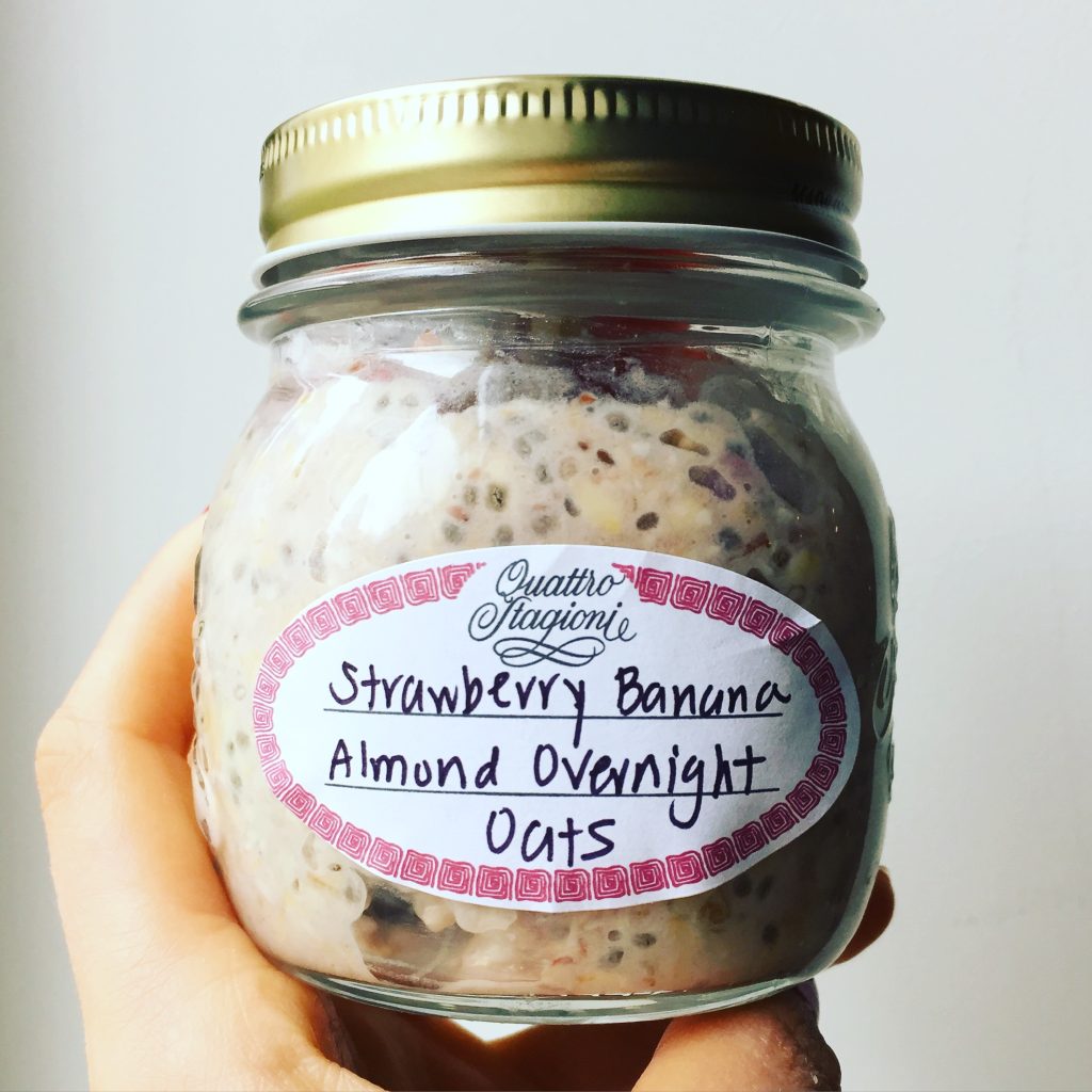 I have a confession: I have been looking at, admiring recipes for, and even recommending overnight oats to friends and clients for a while now. But it was not until yesterday that I actually made some for myself. There is no particular reason: I eat plenty of hot oatmeal and all the other ingredients on a regular basis. Perhaps it was the warm weather that inspired me this week?! (Although yesterday felt like fall again….)