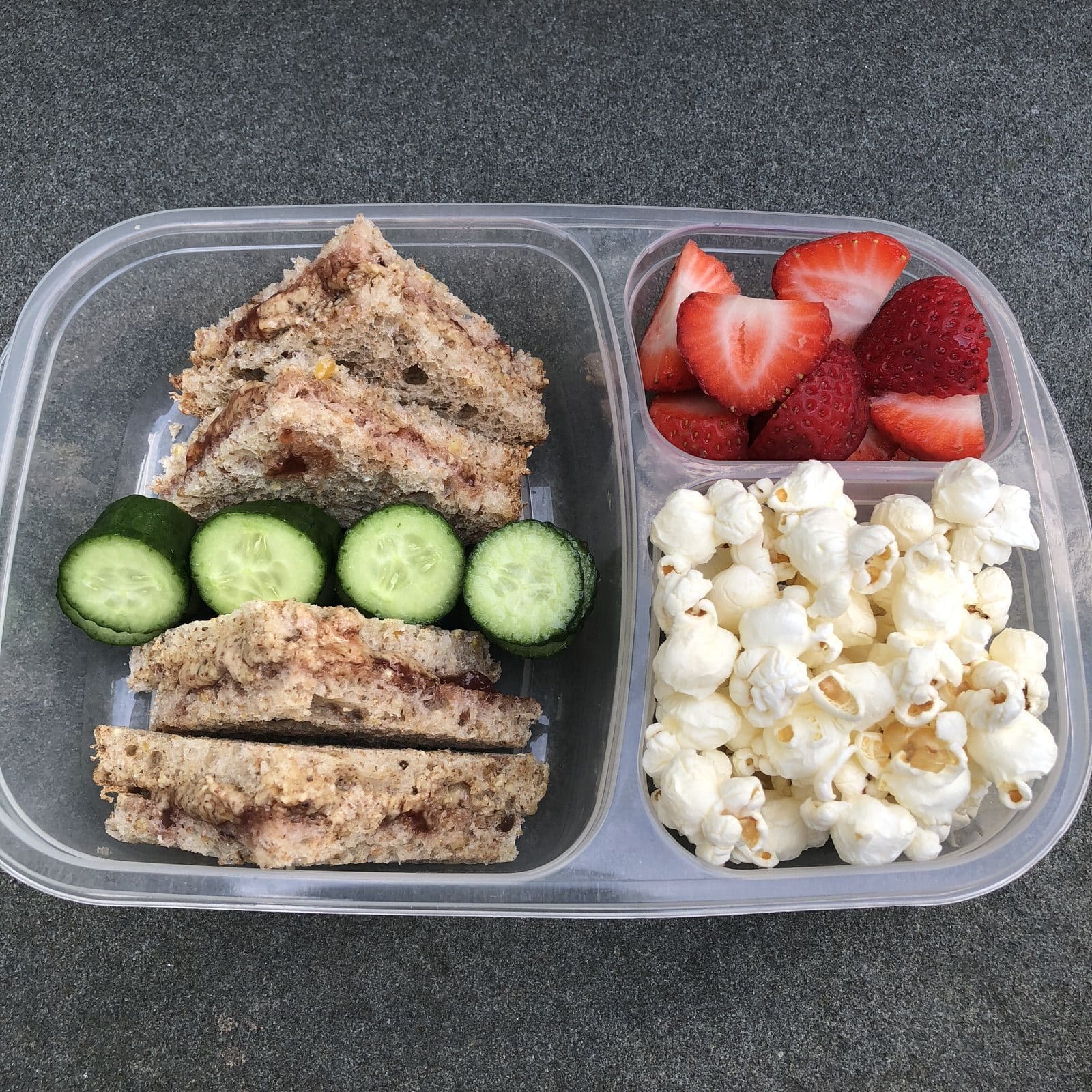 - Almond butter and strawberry jelly on whole grain bread with strawberries, cucumbers, and popcorn