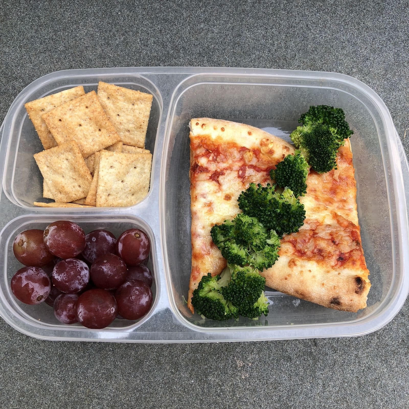 - Pizza, steamed broccoli, red grapes, Simple Mills almond flour crackers.