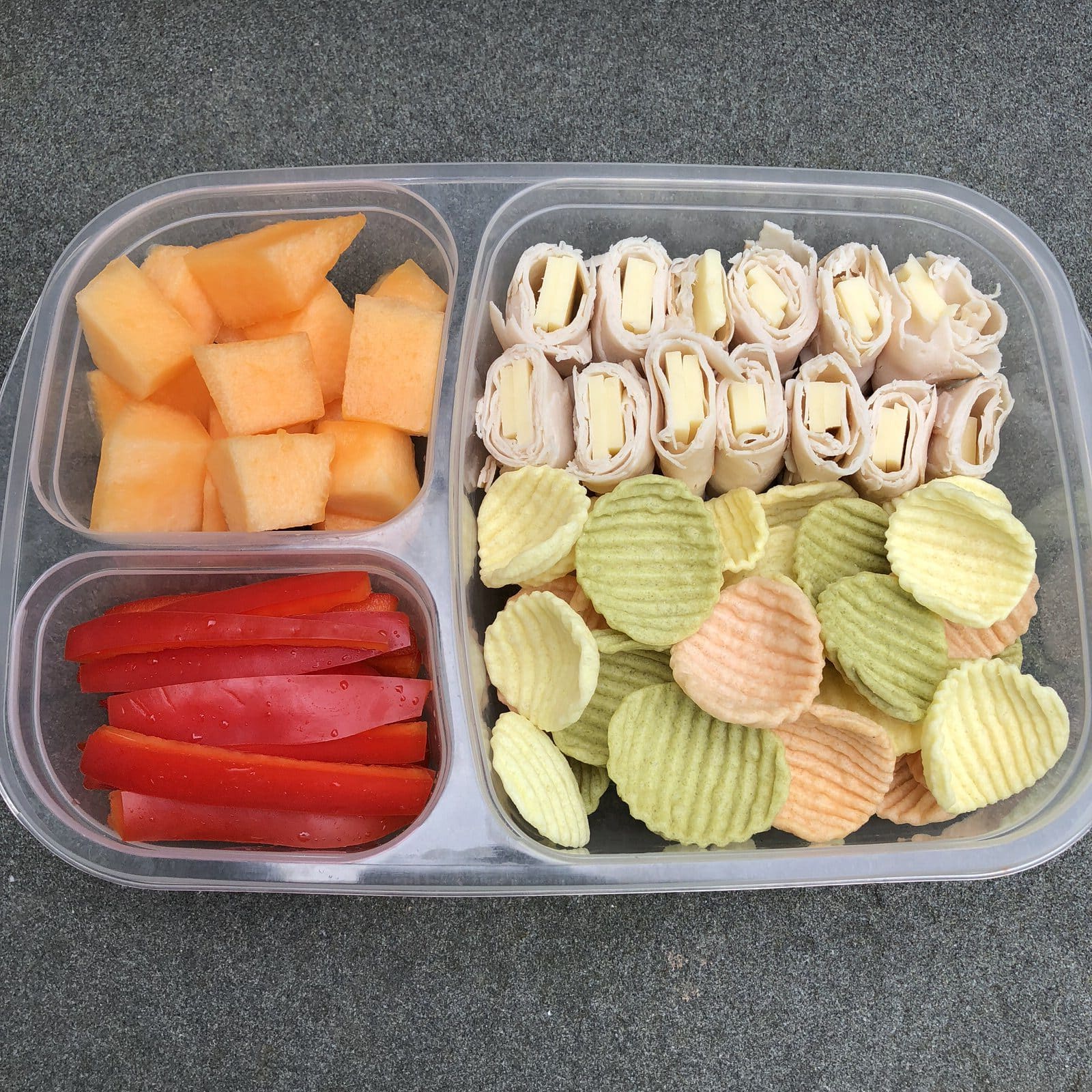 - Turkey and cheese roll-ups, red peppers, cantaloupe, veggie chips