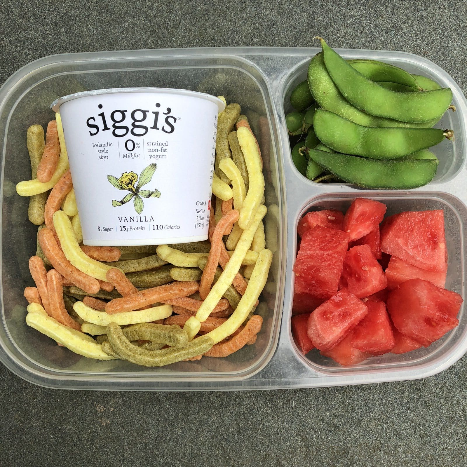 - Siggis vanilla yogurt, veggie sticks, watermelon, edamame